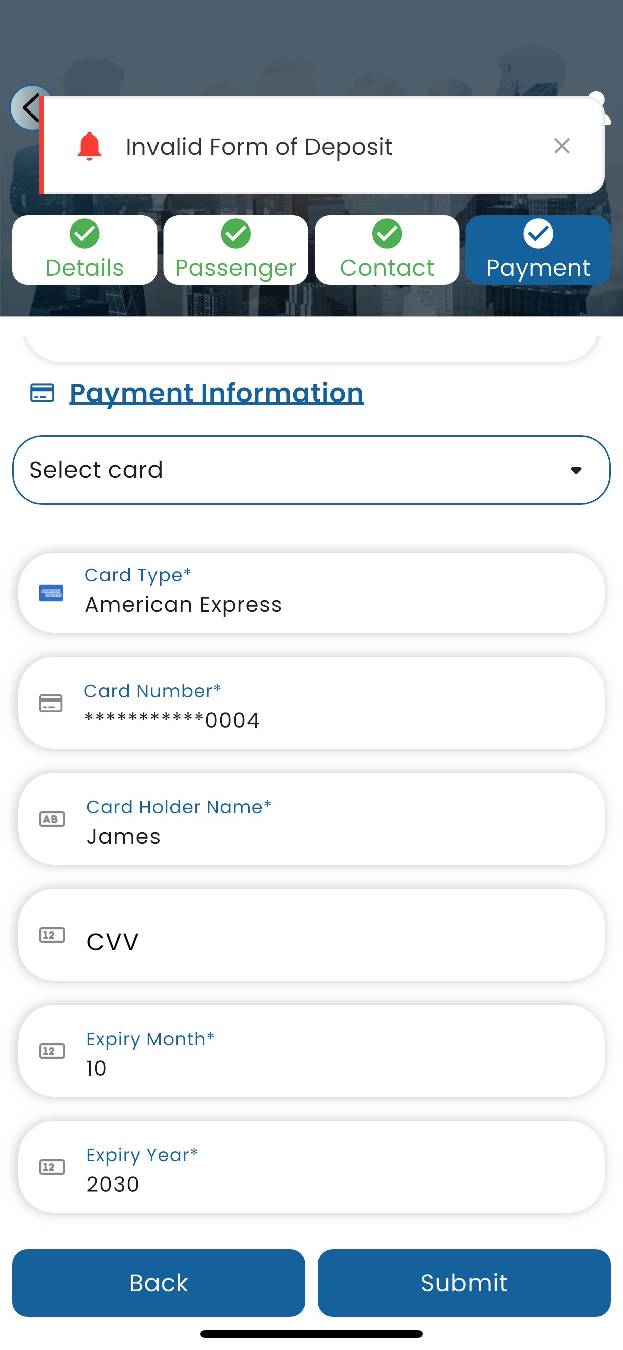 closedNexuskite- Mobile App - Prod - We are getting error "Invalid form of Deposite" on Review page when we add Hotel /Vehicle from the booking Confirmation page.