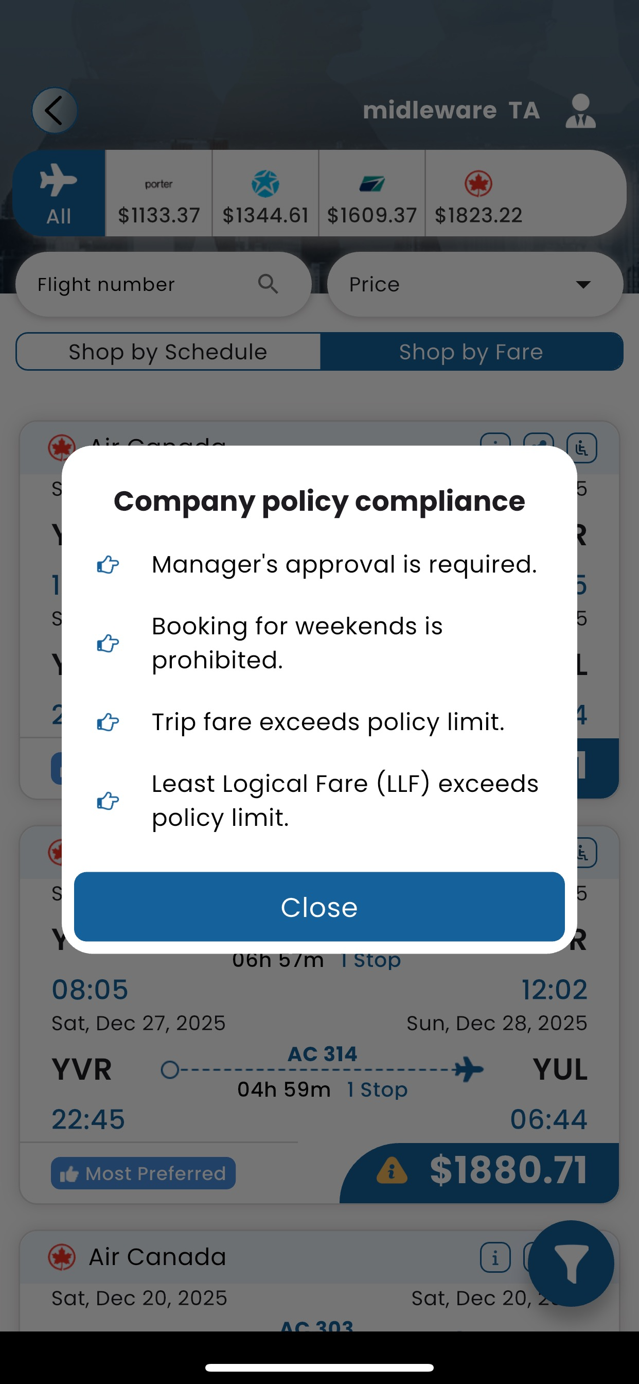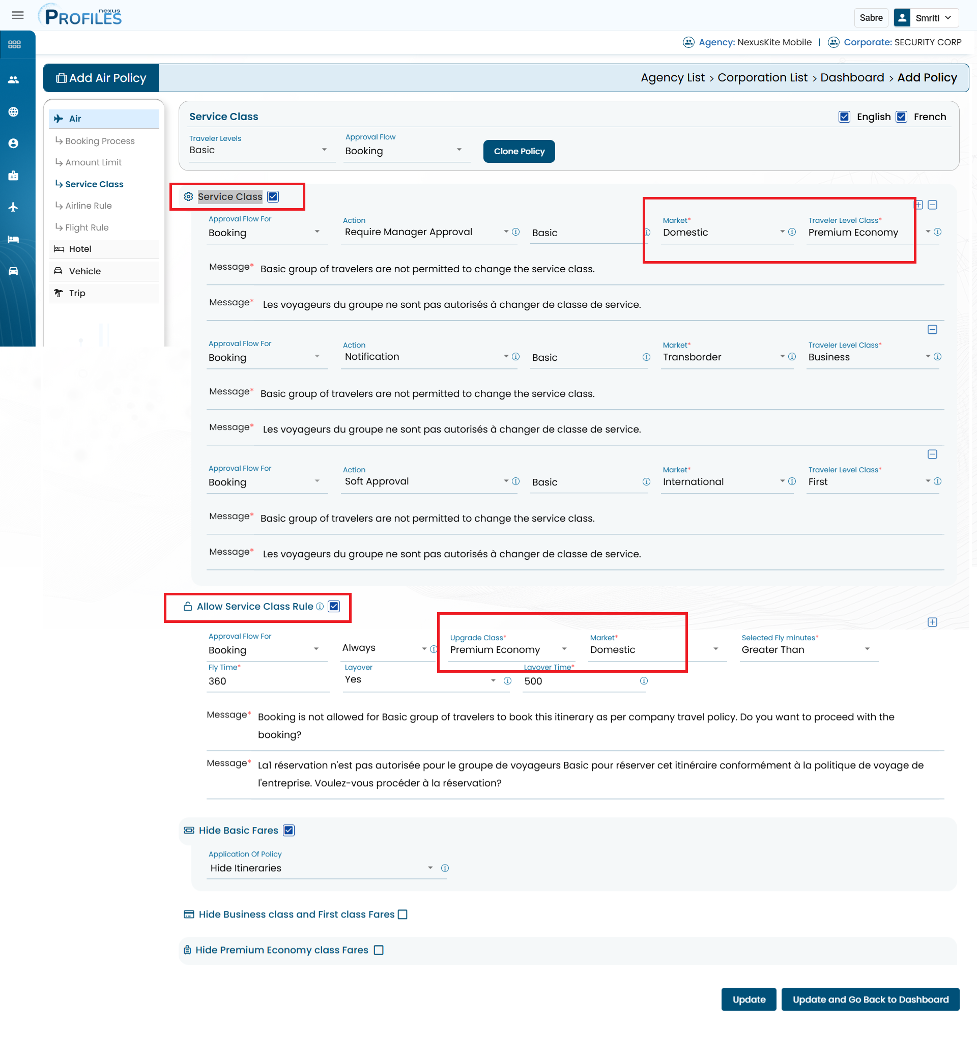 If both "Allow Service Class Rule" and "Service Class" policies are configured for the same market and cabin class, the UI displays the "Allow Service Class Rule" instead of the "Service Class" policy.