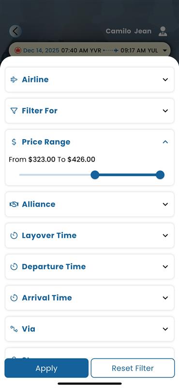 openTask #2169 - nexusKite Mobile App:Middleware Solution.-Travelport -When we apply the Price Range filter for departure in 'Shop by Schedule', the range appears selected for the return flight, but the results do not match the reflected range.